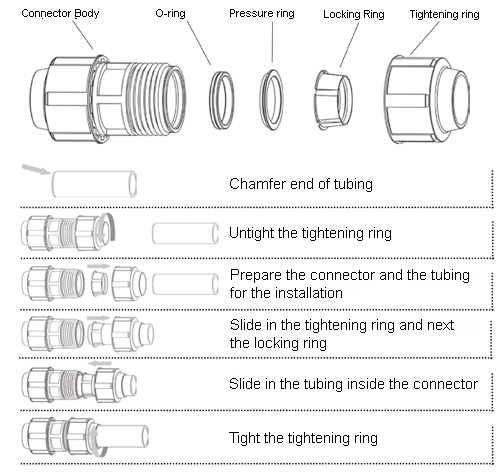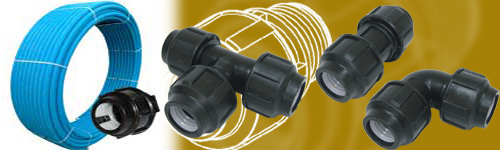 The basic material of the fittings is black polypropylene copolimers. The tightening ring is made of polyacetal and the o-ring is made of EPDM rubber. The tubing is produced in blue and sold in coils.
