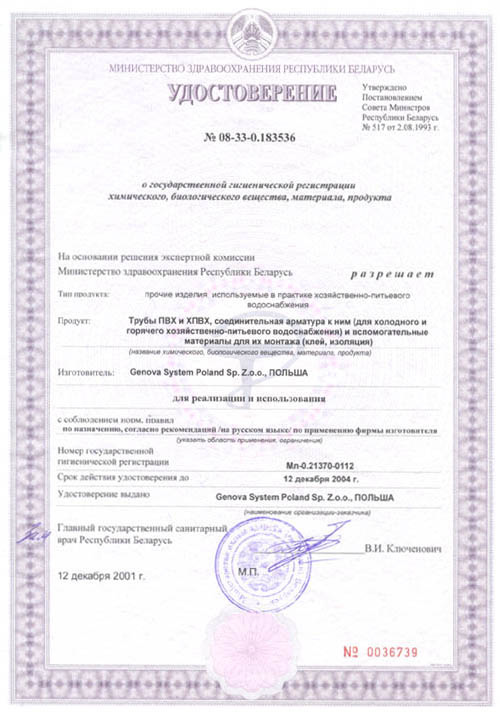 Гигиеническое заключение Министерства Здравоохранения Украины – инсталляции из ПВХ и ХПВХ, ПП тип 3